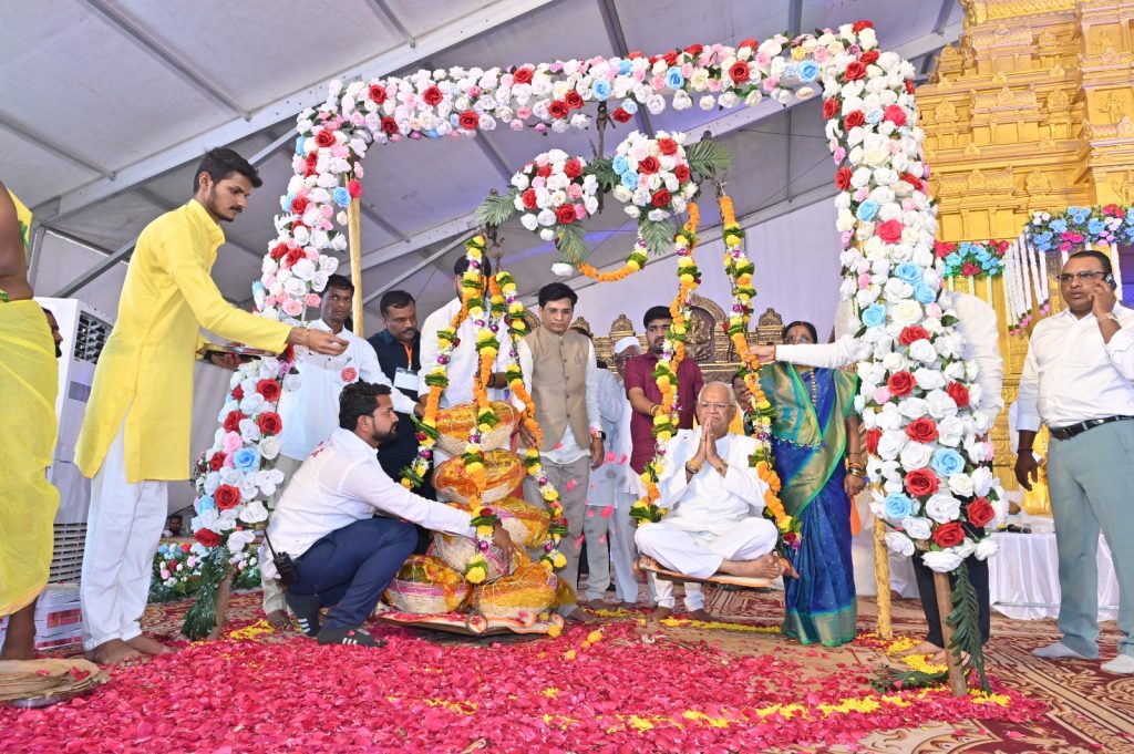 अभिष्टचिंतन सोहळ्यानिमित्त परमपूज्य गुरुमाऊली श्री अण्णासाहेब मोरे यांची ग्रंथ, धान्य आणि मिष्ठान्नाची तुला करण्यात आली. योगायोग म्हणजे मीष्ठानाच्या तुलेमध्ये तिरुपतीच्या लाडवाचा प्रसाद होता आणि व्यासपीठावर साकारण्यात आलेली तिरुपती देवस्थानाची प्रतिकृती सर्वांचे लक्ष वेधून घेत होती. यावेळी गुरुमाता सौ मंदाताई तथा काकूसाहेब मोरे यांनी परमपूज्य गुरुमाऊलींचे औक्षण केले तेव्हा तमाम सेवेकर्यांनी वंदन करून गुरुमाऊलींना निरोगी दीर्घायुष्य लाभो अशी प्रार्थना केली. हा सोहळा अत्यंत हृदयस्पर्शी आणि भावपूर्ण झाला.