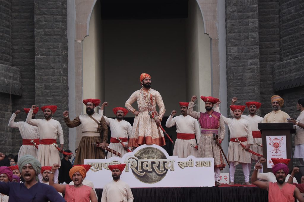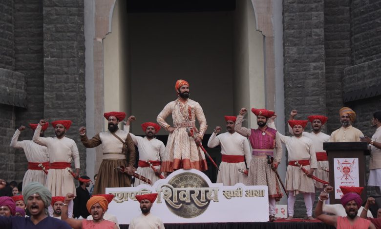 मुंबई – भव्य रंगमंच, दिलखेचक रोषणाई, मंत्रमुग्ध करणाऱ्या वातावरणाला ढोल ताशांच्या गजराची साथ हे सगळंच अगदी भारावून टाकणारं… आणि अशातच भरजरी वस्त्र, शिरोभागी आकर्षक जिरेटोप, गळ्यात आभूषणांसह कवड्यांची माळ, कमरेला लटकणारी भवानी तलवार यांसह घोड्यावर स्वार झालेले साक्षात छत्रपती शिवाजी महाराज आणि त्यांचे पराक्रमी शिलेदार अवतरले आणि एकच जल्लोष झाला…. निमित्त होते ‘रणपति शिवराय स्वारी आग्रा’ या आगामी मराठी चित्रपटातील प्रसंगाच्या सादरीकरणाचे.